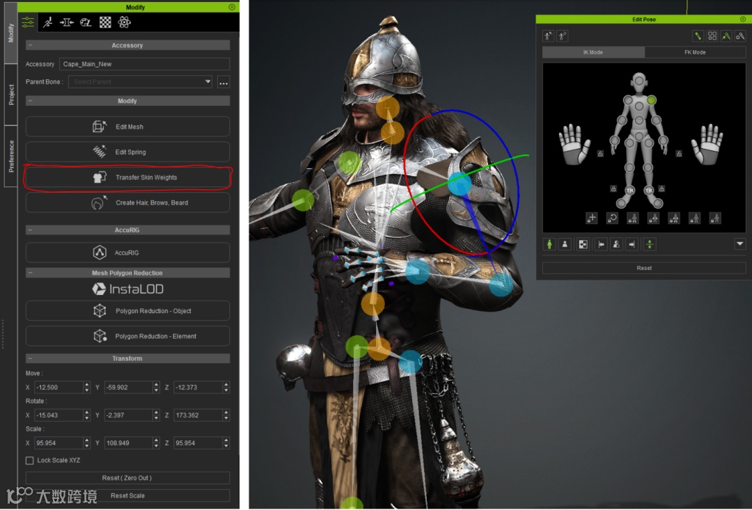 最后,我将皮肤权重从身体转移到盔甲和衣服部分,确保它们被剥皮到骨头并且能够与身体同步移动。