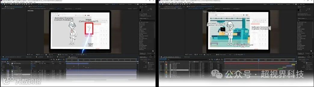在下一阶段,我添加了一些效果来增强视频的冲击力。其中大部分是免费下载的效果,而一些是标准包的一部分。为了实现股票视频中iPad的微妙移动,我使用了运动跟踪来分析和连接从CTA5到Null的动画角色。