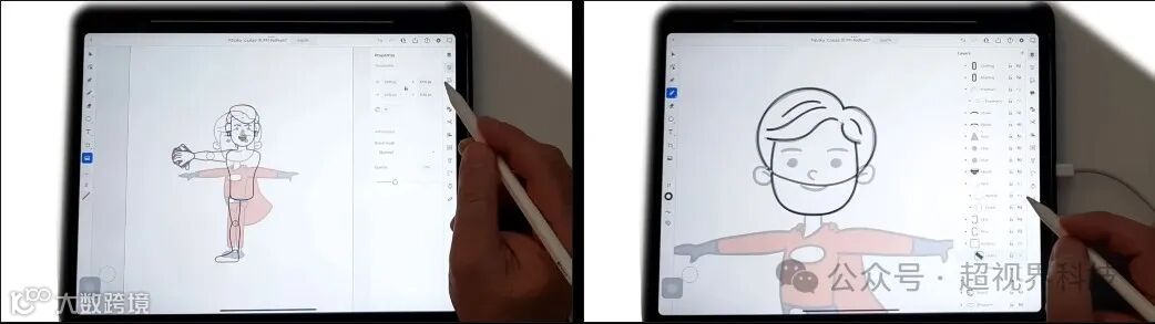 经过几天的脚本编写,我开始用Procreate在我的iPad上绘制角色。我首先用蓝色绘制了他们的简化骨架,然后是黑色轮廓草图,并完成了详细的线条和着色。
