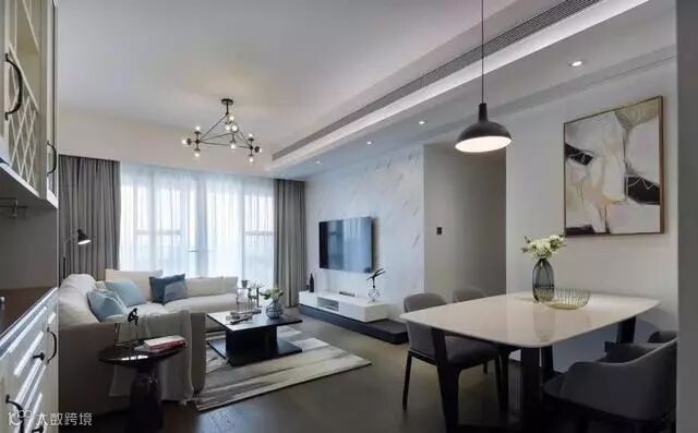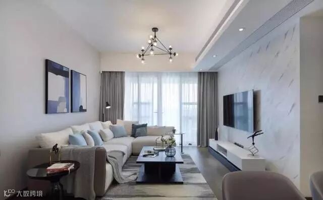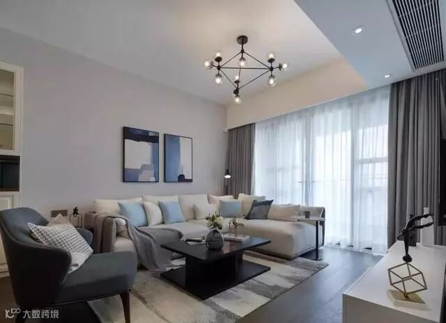 米白色沙发有了浅蓝色的靠枕的加入具有更强的美感了,灰白两层窗帘也时尚,黑色茶几更具神秘感