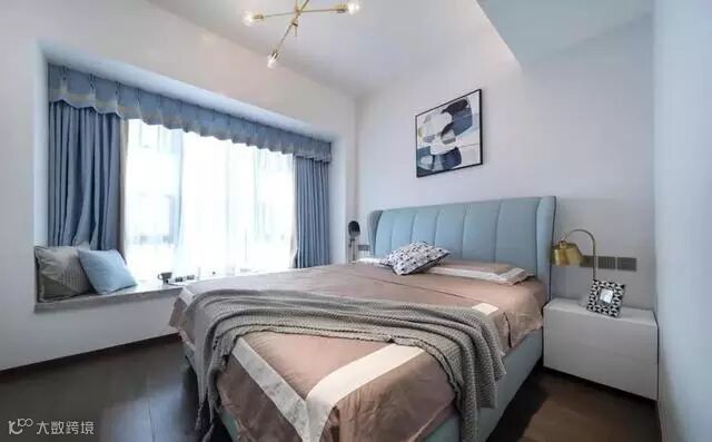 主卧里选用了蓝色的床以及窗帘显得更加的优雅、宁静,同时也有一点很仙的视觉效果。