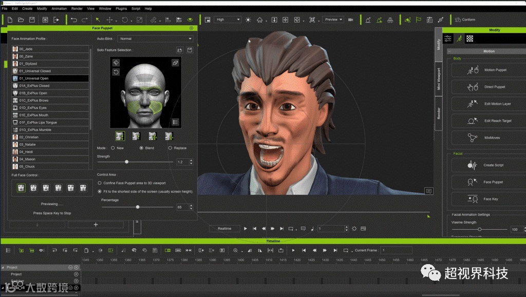 对于其他常规的面部表情,我可以进入iClone面部操偶面板,只需选择面部的一部分,然后移动鼠标。在导出为FBX并在导入虚幻引擎工作之前,我能够创建具有有机外观的面部表情,并在iClone的时间线中为它们设置关键帧,使用我们专有开发工具,我们可以在sequencer中控制面部、手部、身体和唇形同步作为单个角色动画轨迹。