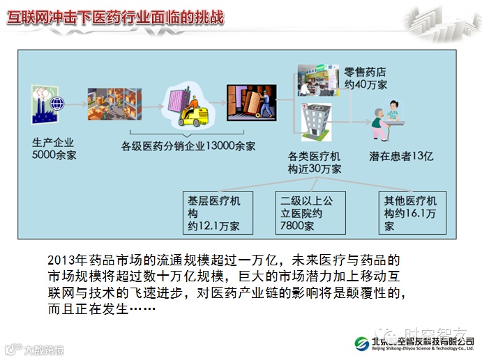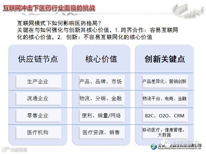 对于传统的批发企业来讲,移动互联网的冲击可以肯定的说,依靠批零差价来生存的模式肯定会收到巨大的冲击,或者说批发这个业态极有可能消失,批发企业的转型之一就是考虑建立统一的信息平台,建立医药生态圈,否则生产企业极可能直接切入零售终端,比如:修正药业建立的修正堂;并且很多批发企业已经意识到了这个危机,并已经着手进行信息化布局,例如山西的碧锦纳川医药公司;