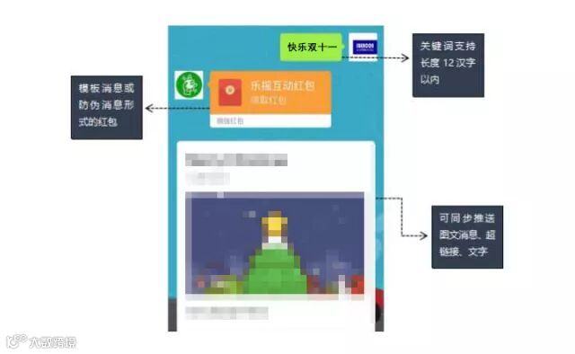 玩法介绍:设置红包关键词(例如:快乐双十一),粉丝发送指定关键词就能领取现金红包,红包支持固定及随机金额。