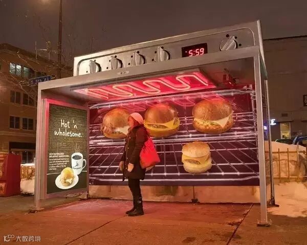 ↑↑这是一个烤箱广告。寒冷的冬夜,你在站台等公交车来,有这么一个烤箱就在你身后温暖着你,你一定会仔细去看它旁边的海报宣传,品牌印象分骤增。