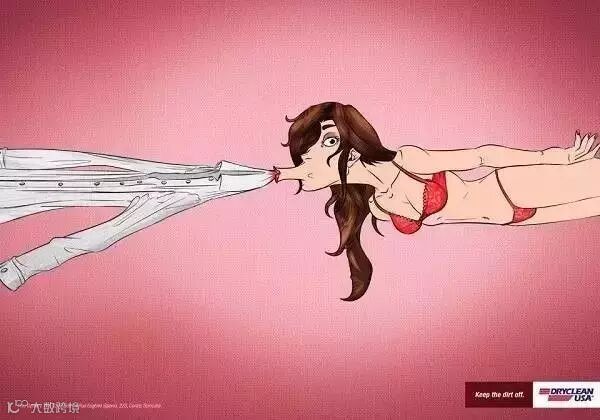 ↑↑这是一家干洗店的广告。它用夸张幽默的表现手法告诉大家,无论是什么污渍,它都可以帮你统统甩掉,包括唇印、油渍和酒渍等让大家头疼的顽渍。