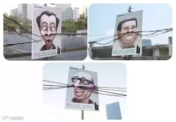 ↑↑这个是松下鼻毛修剪器的广告。不难看出,它在提醒你要修剪你过长而浓密的鼻毛了,而且这个广告还顺便帮市政梳理了杂乱的电线。