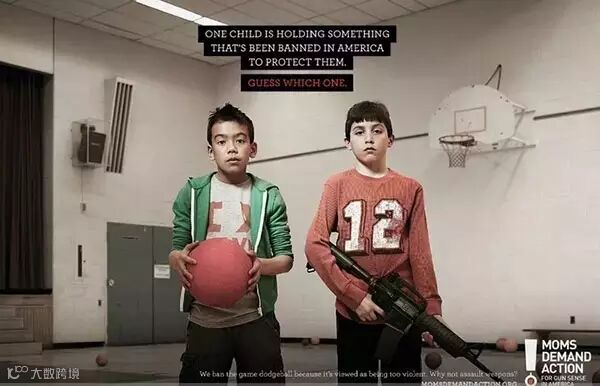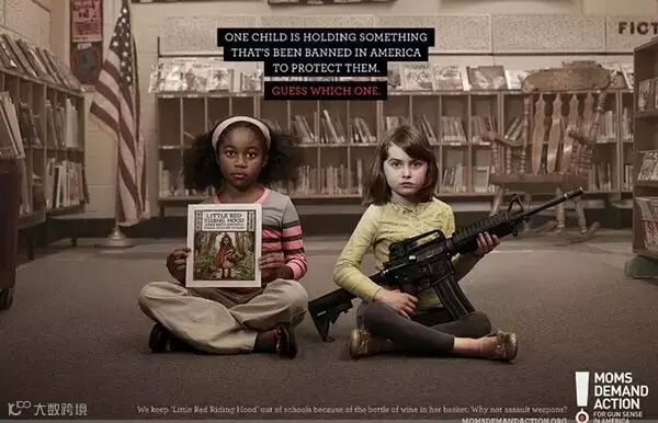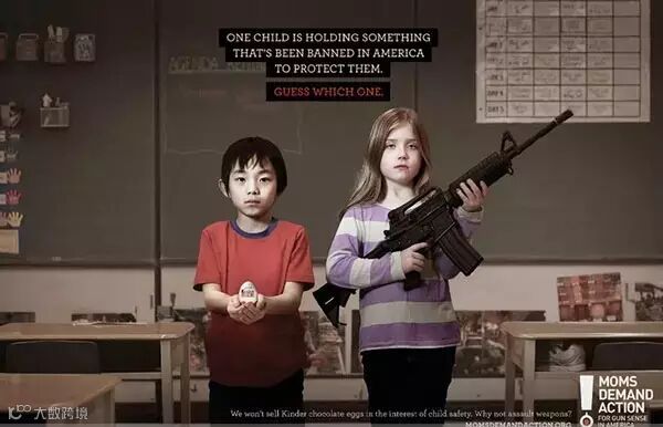 ↑↑这是一个美国禁枪行动的公益广告,每一张图上面的黑字写着:为了保护孩子们,图片上其中一个孩子手上拿的东西,在美国是禁止,猜猜看是哪一个?第一张图下面的白字写着:躲避球游戏被视为太过暴力而被禁止,但枪却可以?第二张图写着:为孩子的安全着想,我们禁止销售Kindle巧克力蛋,但枪却可以?第三张图写着:我们把教科上的《小红帽的故事》删除掉,理由是她的篮子里有一瓶酒,但枪却可以?