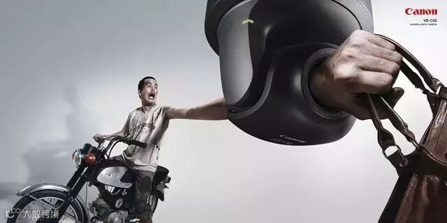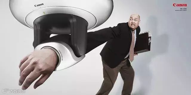 ↑↑这是佳能监控摄像头的广告。摄像头看上去像个牢牢铐住犯人的手铐,非常形象,广告旨意告诉大家,不论是杀人犯、小偷、抢劫犯,通通都逃不过佳能监控摄像头的法眼。