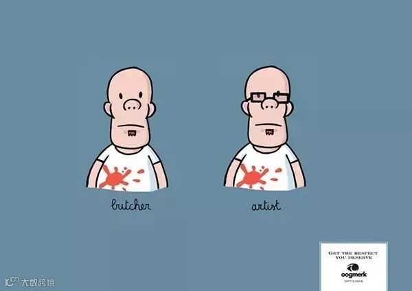 ↑↑这是Oogmerk眼镜广告,广告旨意阐述屠夫与艺术家的改变。左边人像下面的注释是屠夫;右边人像下面的注释是艺术家,右下角的文案是:改变自己,得到你应有的尊重。