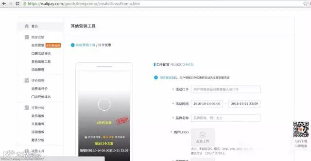 点击旁边“点击设置”进入设置界面,口令用于提高消费者对商家品牌记忆的功能,商家设置自己的品牌名称或广告语成为密令,消费者只有输入密令之后才能领取优惠卡券。