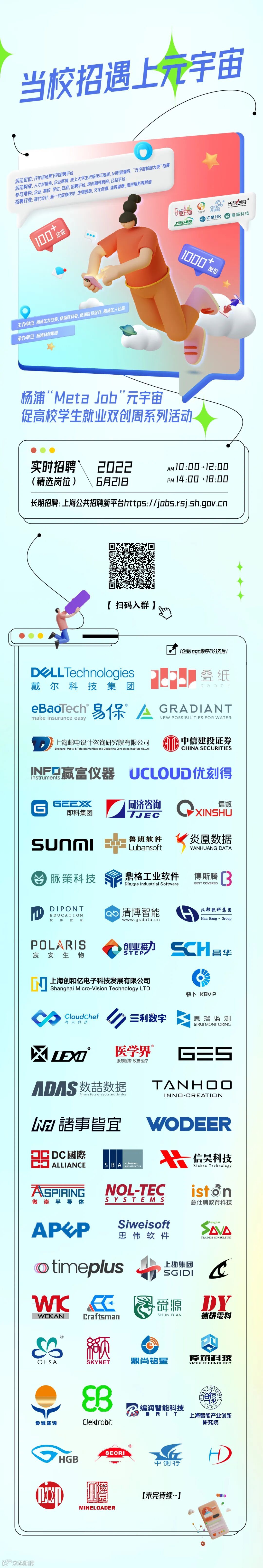 今年以来,受疫情和国际形势更趋复杂等影响,上海大部分市场主体困难增多,部分重点群体求职难度加大。为推动创新和创业,精准施策,助企纾困,稳岗促就业,本次活动将围绕在2022年全国双创周“创新增动能、创业促就业”的核心主题下开展,活动将重点打造元宇宙场景下的创新招聘平台,由人才对接会、企业路演、线上大学生求职技巧培训、1v1职涯辅导、“元宇宙招聘官”认证等活动组成。