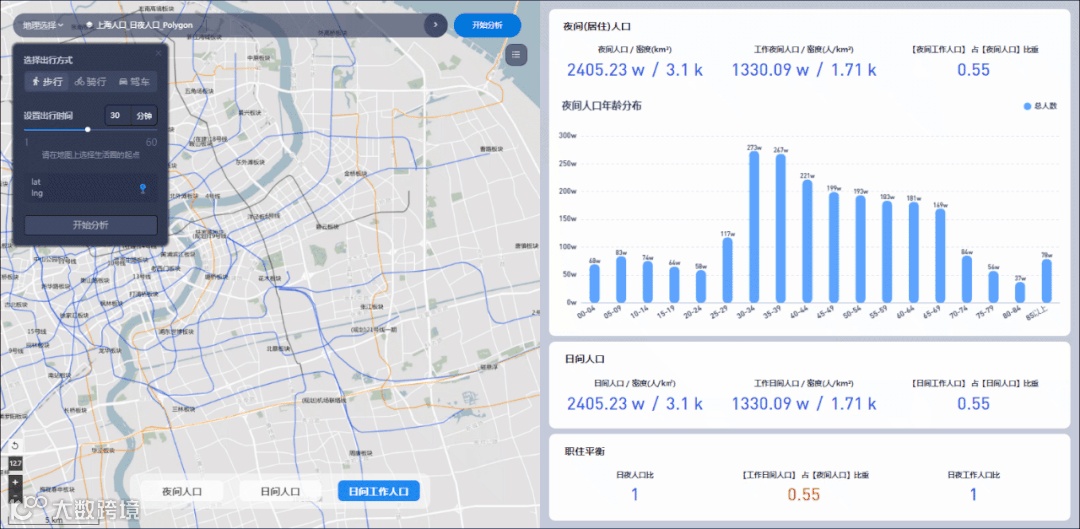 人口、配套大数据分析(自由设定等时圈/围栏进行查询)