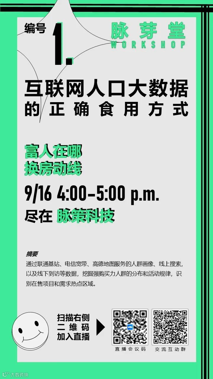 如果您在 房地产投资、营销、客研 等部门履职,或关注互联网大数据的应用和探索,相信本期「脉芽堂 WORKSHOP」会为您带来不一样的收获。