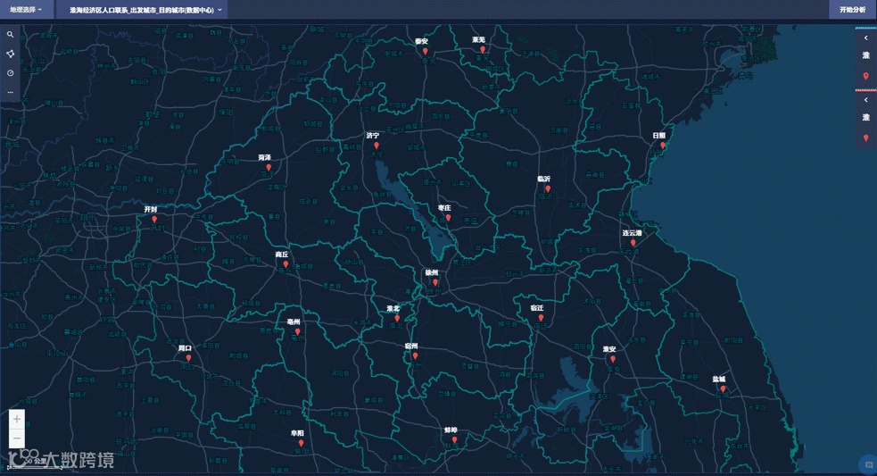 在创建好的地理可视化的卡片中,可以任意进行空间的查询和分析工作,可以选择不规则多边形,也可以根据距离查询,你也可以加载已有的地理板块围栏数据,进行板块的查询。
