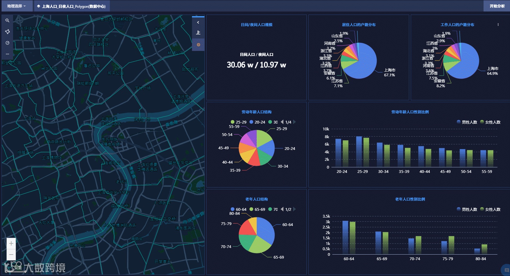 结合上述的交互式图表,可以将地理卡片与图表在工作台上进行组合拼接,一次制作,就可以解决过去重复的繁琐工作,点击分析即可得到分析结果。