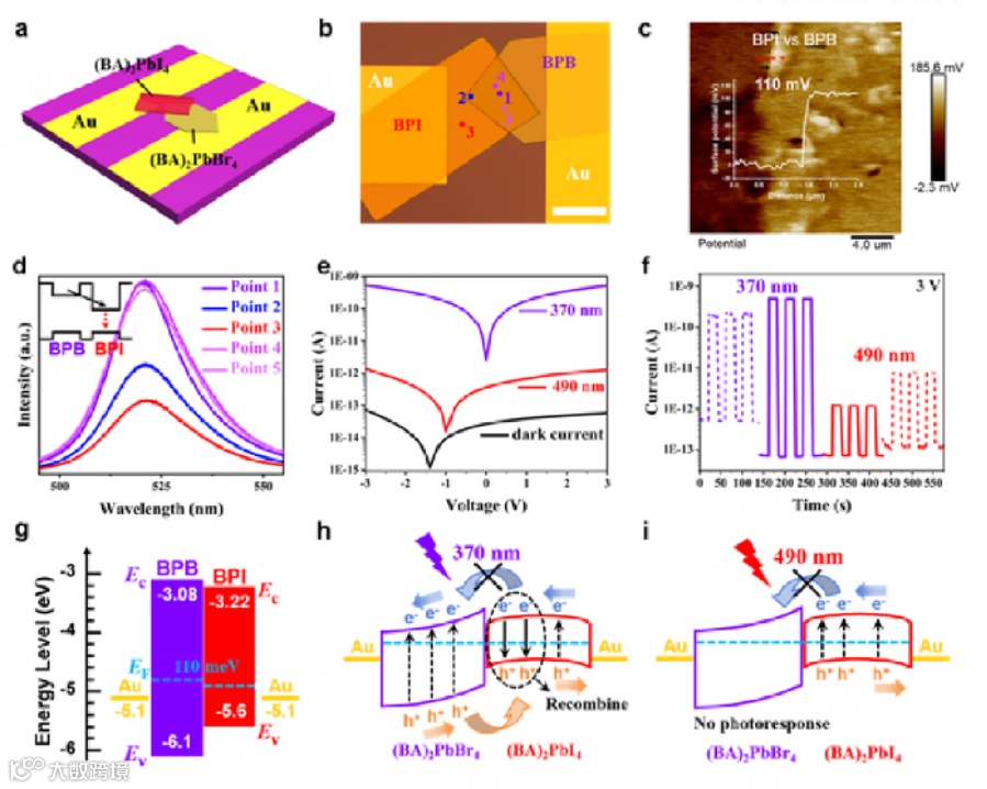 图4. (a)异质结器件结构示意图。(b)典型异质PD器件的光学图像。标尺:50 μm。(c)BPB/BPI异质结构的KPFM表征。(d)在b中标记的不同点收集的共聚焦PL光谱,插图为两个相的简化能带图。(e)器件调制后的I-V曲线。(f)3V偏压下的I-t曲线,虚线为未调制时对应单个组件的数据。(g)BPB和BPI接触前的能量带结构。(h,i)分别在370nm和490nm光照下异质PD型-Ⅰ能量带对齐图。