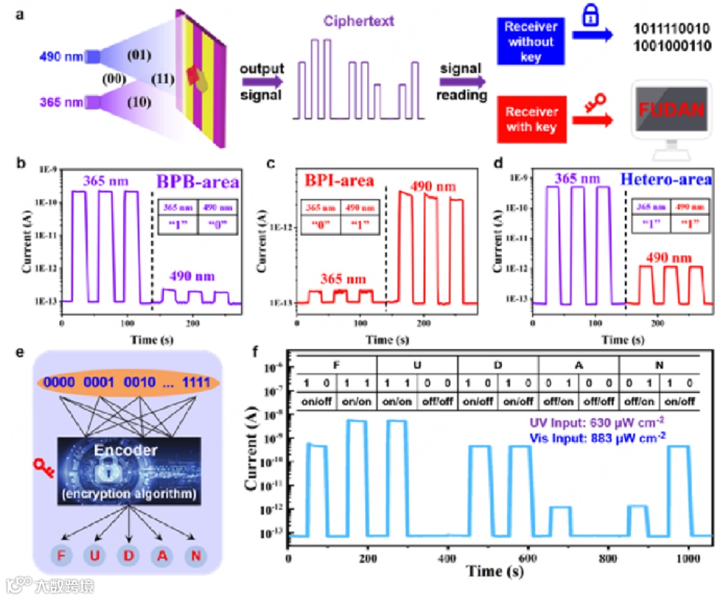 图5. (a) BPI/BPB 范德华器件的光通信系统示意图。(b, c, d)在3v偏压下不同照射区域的I-t曲线。(e)加密算法生成密钥的机制。(f)双光束辐照模式实际输出的“10111100101001000110”双字节信号。