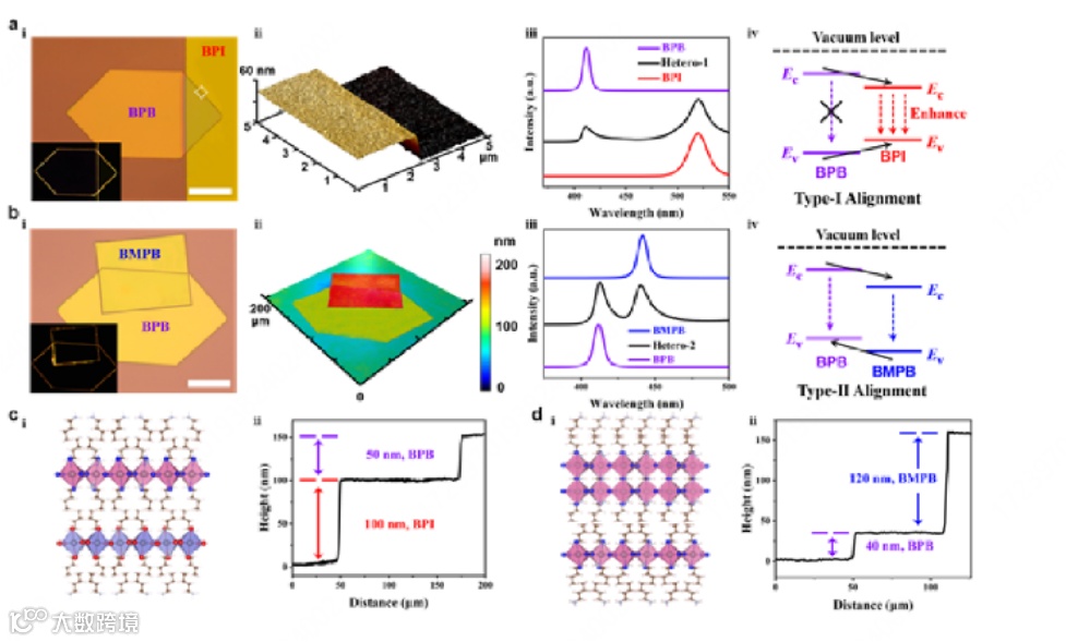 图2. 制备的二维垂直RP异质结构的表征。(a) 异质结构1。(i) 在Si/SiO2基底上的光学图像,插图为暗场下的对应图像。标尺:50μm。(ii)AFM三维图像(选择白色虚线区域)。(iii)分别在各区域采集的归一化共聚焦PL光谱。(iv)异质结构1的型I能带对齐。(b) 异质结构2。(i) 在Si/SiO2基底上的光学图像,标尺:50 μm。(ii)对应的LSM三维图像。(iii)归一化的共聚焦PL光谱(ⅳ)异质体2的型Ⅱ带对齐。(c,d) 异质体1和异质体2的示意图(i) 和高度剖面图(ii)。