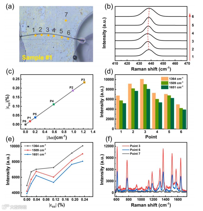 图2,(a)用10 s Ag NPs装饰的弯曲ZnO微线的光学显微图像,这是进行拉曼测量的位置。(b)记录了E2high在微米线上不同区域的拉曼光谱。(c) E2high拉曼峰位移随诱导应变值在不同位置的变化趋势。(d)在不同位置的弯曲ZnO/Ag衬底上检测到5×10−8 M R6G在1364 cm−1、1509 cm−1、1651 cm−1三个特征峰处的拉曼强度。(e)应变值与不同位置采集的各R6G特征峰积分强度的关系图如图2a所示。(f)分别在压电ZnO/Ag微腔(点3,红线)、ZnO/Ag(点6,蓝线)和石英/Ag(点7,黑线)中采集R6G (5×10−8 M)的拉曼光谱。