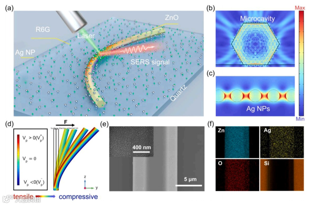图1. (a) 压电增强ZnO/Ag微腔SERS基础底示意图;(b) 用有限元方法模拟的微腔内的光场分布。(c)银纳米粒子之间形成的热点区域。(d) ZnO微米线受机械力偏转后的压电电位分布。(e) ZnO微米棒/Ag纳米粒子的SEM图像。插图为银纳米粒子,溅射时间为10秒。(f)与(e)对应的复合SERS衬底的Zn、Ag、O元素映射图。