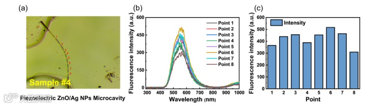 图S5,(a)弯曲ZnO/Ag微腔SERS衬底光学图像。(b) R6G (5×10-5M)沿ZnO/Ag NPs微线八个位置的荧光光谱。(c)柱状图中荧光强度与位置的关系图。