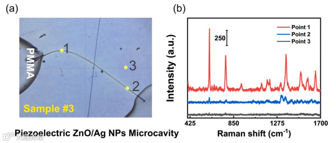 图4,(a) SERS衬底的光学显微照片。(b)压电ZnO/Ag NPs杂化结构(点1,红线)、ZnO/Ag NPs微腔(点2,蓝线)和石英/Ag NPs(点3,黑线)在10−13 M DA下的拉曼光谱。