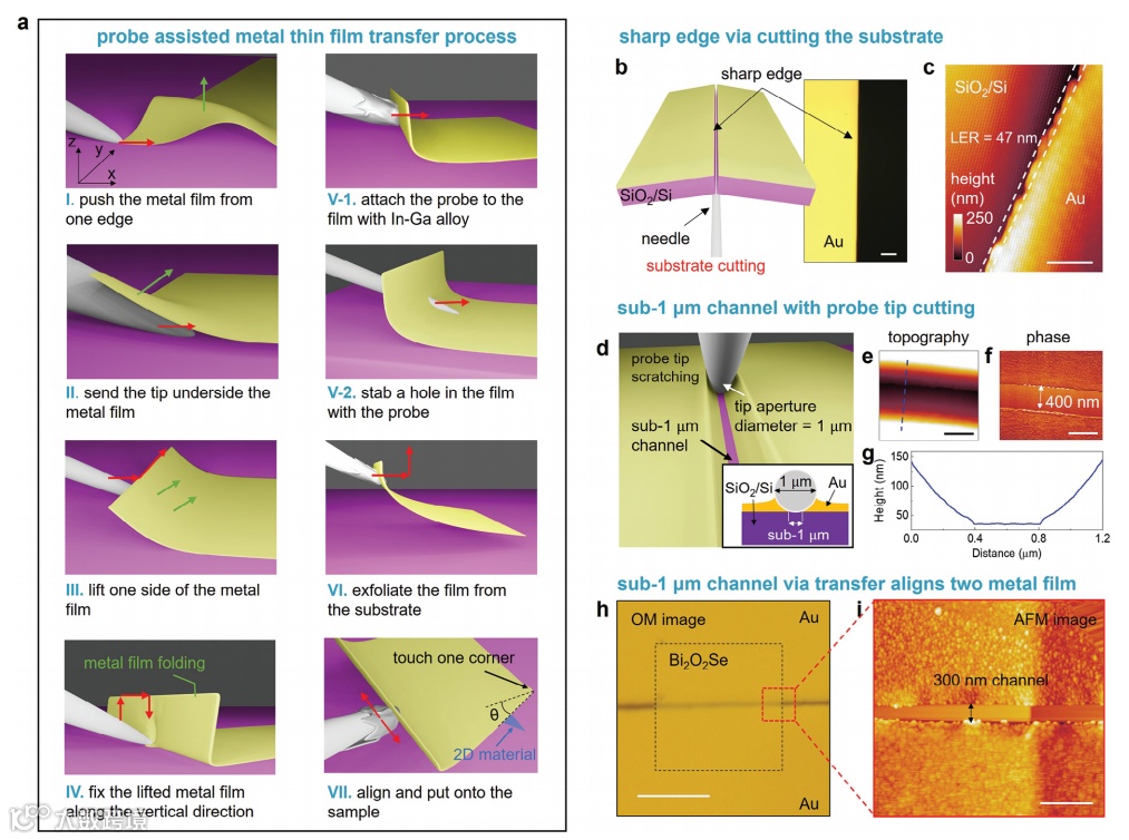 图2. 金属薄膜转移和亚微米级分辨率工程的详细过程。a) 示意图显示了探针辅助金属薄膜转移过程中探针尖端移动方向(红色箭头)和金属薄膜变形方向(绿色箭头);b) 切割硅基底以获得锋利边缘金属薄膜的示意图。右图显示了薄膜锋利边缘的光学显微镜(OM)图像。比例尺:10μm;c) Ag/Au薄膜转移到SiO2/Si基底上后,其边缘的原子力显微镜(AFM)图像。比例尺:200nm;d) 用探针尖端刮擦金属薄膜制造亚微米级宽度沟槽的示意图。插图:展示了探针尖端和基底之间的接触区域,该区域远小于尖端直径,从而产生了较小的沟槽宽度;e) 刮擦沟槽的AFM形貌图像。比例尺:500nm;f) 刮擦沟槽的AFM相位图像。比例尺:500nm;g) 沿图2e中标有蓝色虚线的高度轮廓;h) 通过将两个金电极转移到Bi2O2Se薄片上制造的器件的光学显微镜图像。黑色虚线矩形框出了Bi2O2Se薄片。比例尺:10μm;i) 图2h中标记区域的AFM图像,展示了器件的300nm沟道长度。比例尺:1μm。