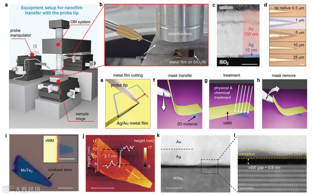 图1. 光学显微镜下的探针转移范德华金属薄膜(PVOM)。a) PVOM设备的示意图,包括光学显微镜和探针操作器;b) 探针尖端辅助金属薄膜操作条件的照片,包括长工作距离的物镜和探针尖端;c) 金属薄膜的横截面扫描透射电子显微镜(STEM)图像,包括10nm的银层和150nm的金层。比例尺:50nm;d) 不同探针尖端半径的探针的光学显微镜(OM)图像,范围从0.5到25μm。比例尺:100μm;e) 用探针尖端切割金属薄膜的示意图;f) 将金属薄膜转移到平面基底上目标薄片上的过程的示意图;g) 用范德华金属掩模(vMM)覆盖一半区域的薄片处理过程的示意图;h) 金属薄膜从目标薄片上脱离过程的示意图;i) 通过vMM辅助处理得到的代表性结果。一个MoTe2薄片在vMM覆盖一半区域的情况下暴露在O2等离子体中3分钟(插图),然后移除掩模以捕获OM图像。比例尺:10μm;j) 与图1i对应的原子力显微镜(AFM)图像。插图显示了图1j中标有白色虚线的高度轮廓。比例尺:10μm;k) WSe2薄片上vMM覆盖层的横截面STEM图像。比例尺:10nm;l) 图1k中标有黑色虚线区域的STEM图像放大图。比例尺:2nm。