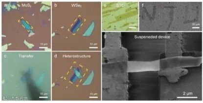 图4.(a)(b)机械剥离法在衬底上分别制备出二硫化钼和二硒化钨样品(c)在乙醇中将二硫化钼样品转移到二硒化钨样品上方(d)新的异质结构造完成(e)衬底上制备出钛酸锶样品(f)乙醇辅助的转移方法构造出“NJU”的人工结构(g)钛酸锶样品成功转移到悬空器件上