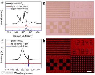 通过对探针刮擦区域及原始MoS2薄膜区域的拉曼(图1(e))、荧光(图1(f))光谱测试,证实了超声处理对单层MoS2薄膜的质量几乎没有影响。为了再次证明机械划擦和超声处理的清洁性,作者们涉及了如图1(g)所示的各类图案(条带、数字、正方形、棋盘),并在超声处理后进行了荧光显微光学照片的拍摄(图1(h)),从高对比的荧光显微照片中,该论文再次确认该装置制备的图案化结构的清洁性,于此同时,保留了二维材料较高的光学质量。