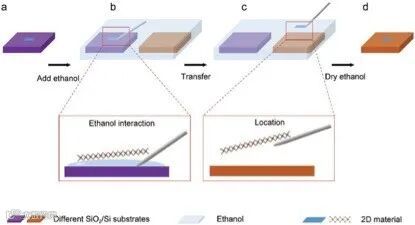 图3.(a)机械剥离法在衬底上制备出二维材料样品(b)在体系中加入乙醇,乙醇自发插层进入二维材料和衬底之间,并使用钨针挑起样品(c)将样品定位转移到目标位置(d)乙醇挥发后整个转移过程完成