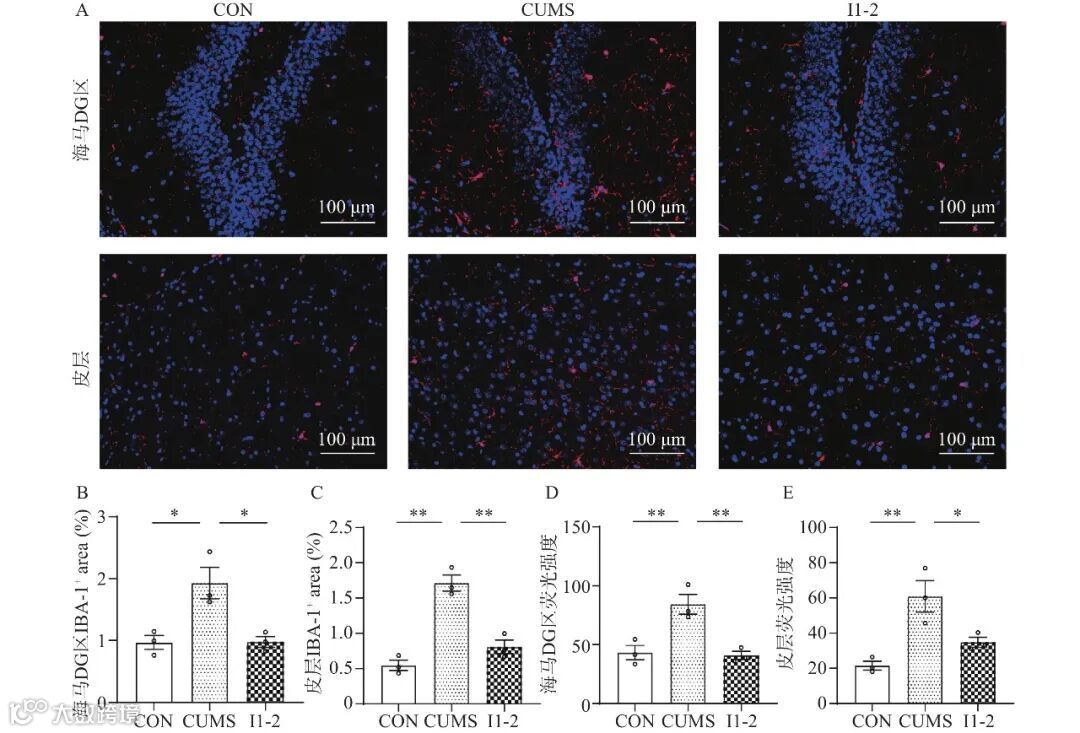 图 5 乳酸片球菌I1-2对CUMS小鼠海马DG区及皮层神经小胶质细胞过度激活的影响(n=3)