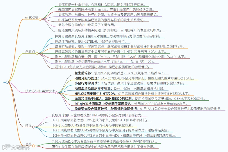 本章节总结了乳酸片球菌I1-2能显著缓解小鼠的抑郁焦虑行为,其机制包括提高脑内神经递质水平、调节氧化应激、减轻神经炎症并抑制小胶质细胞过度激活,为开发相关功能食品提供了依据。