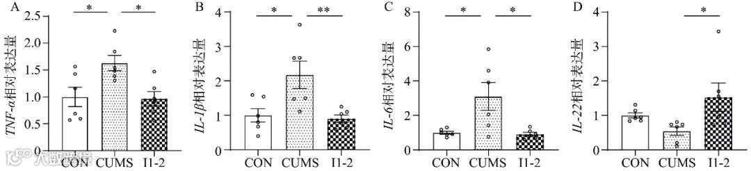图 4 乳酸片球菌I1-2对CUMS小鼠海马中炎症因子基因表达的影响(n=6)