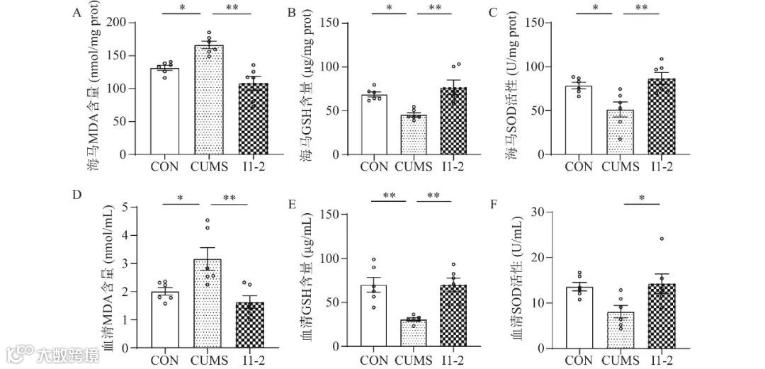 图 3 乳酸片球菌I1-2对CUMS小鼠海马和血清中MDA、GSH水平及SOD活性的影响(n=6)