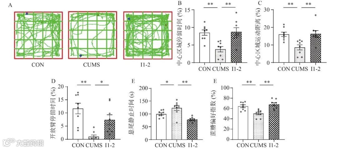 图 1 乳酸片球菌I1-2对CUMS小鼠抑郁焦虑样行为的改善作用(n=8)