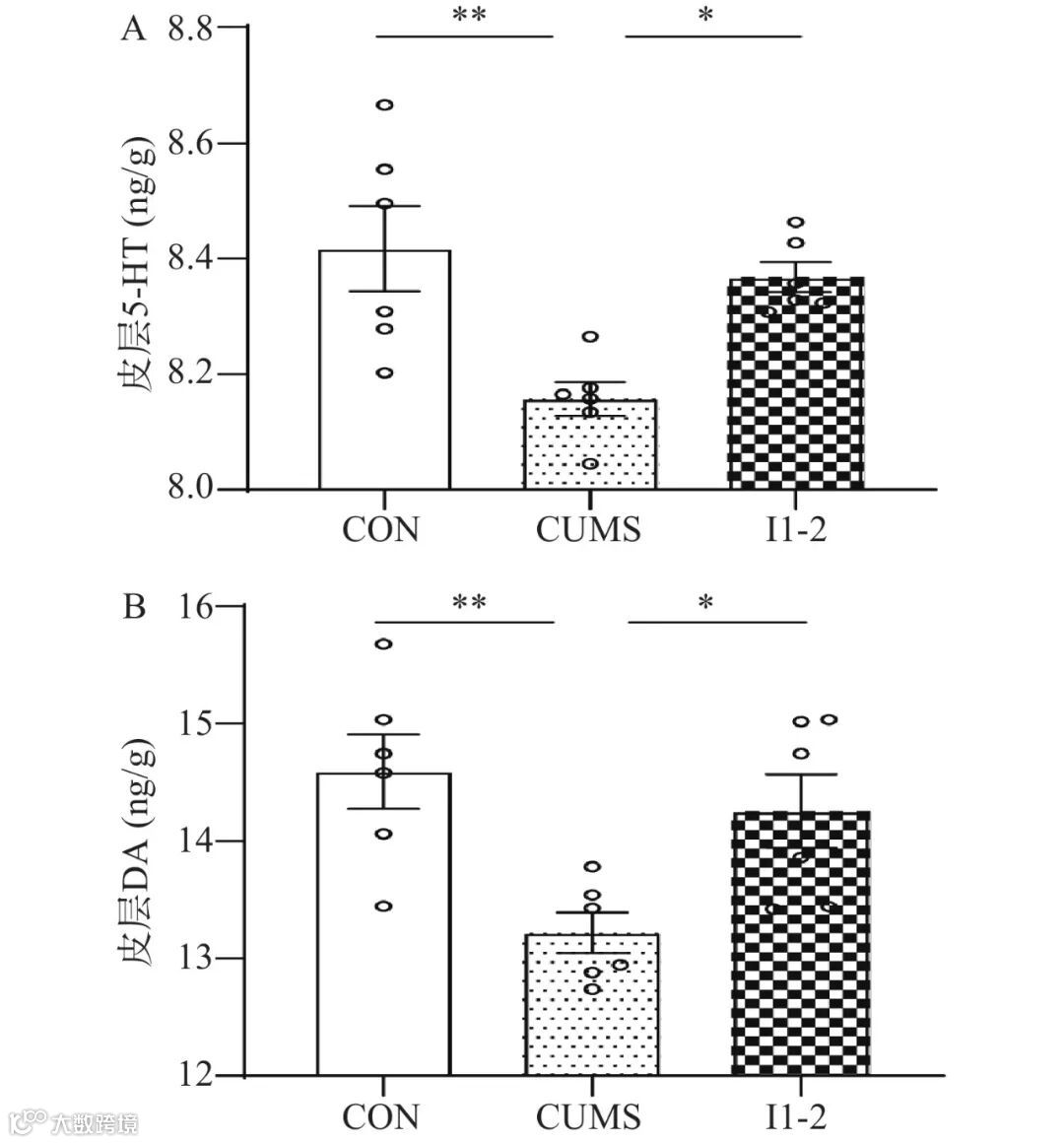 图 2 乳酸片球菌I1-2对CUMS小鼠皮层中5-HT和DA水平的影响(n=6)