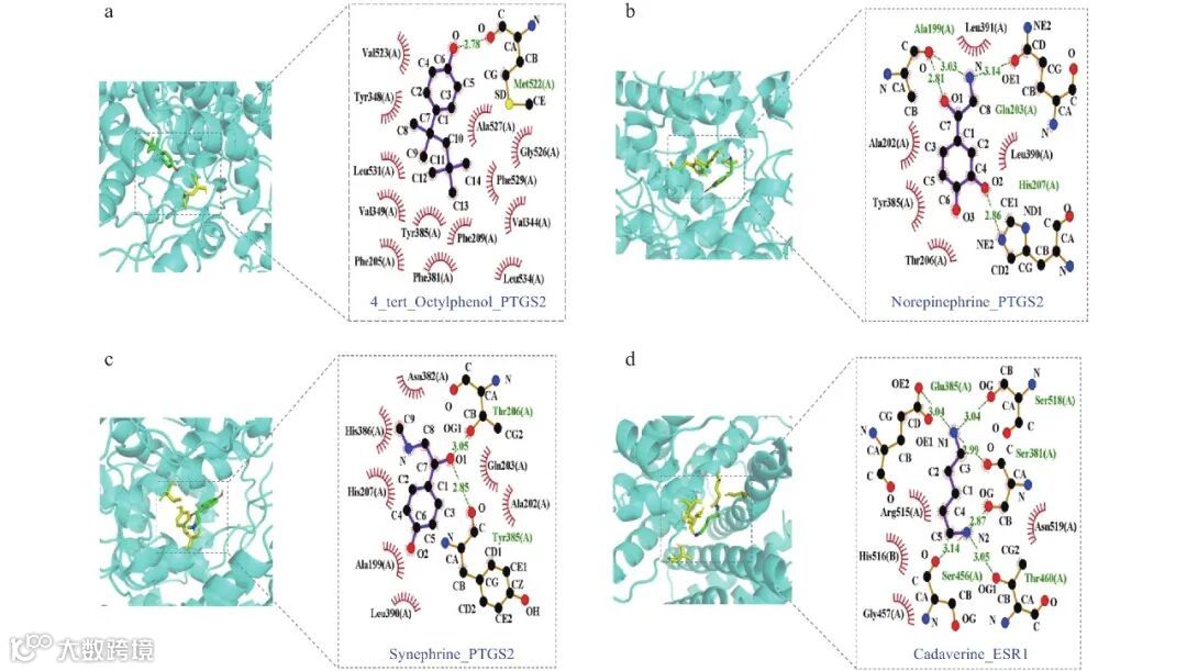 注:a、b、c分别代表4-叔辛基苯酚、去甲肾上腺素、辛弗林与PTGS2的分子对接情况;d为1,5-戊二胺与ESR1的分子对接情况;毛刷状表示与配体发生的疏水作用,绿色虚线代表与配体结合产生的氢键。