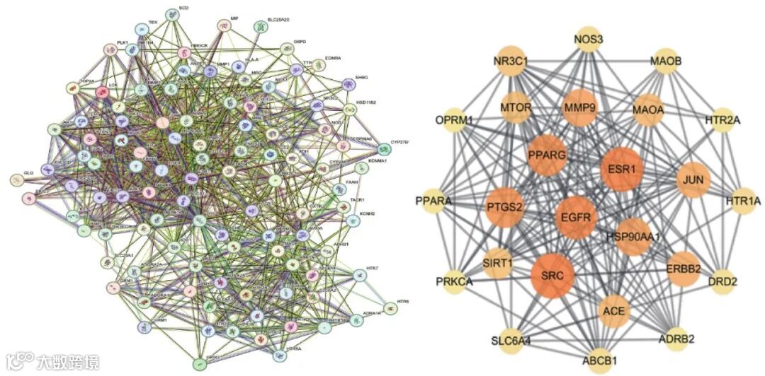 图 6 蛋白相互作用网络图(左)及核心靶点图(右)
