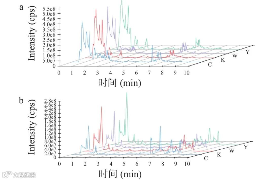 图 1 正(a)和负(b)离子模式下牡蛎消化样本的总离子流图