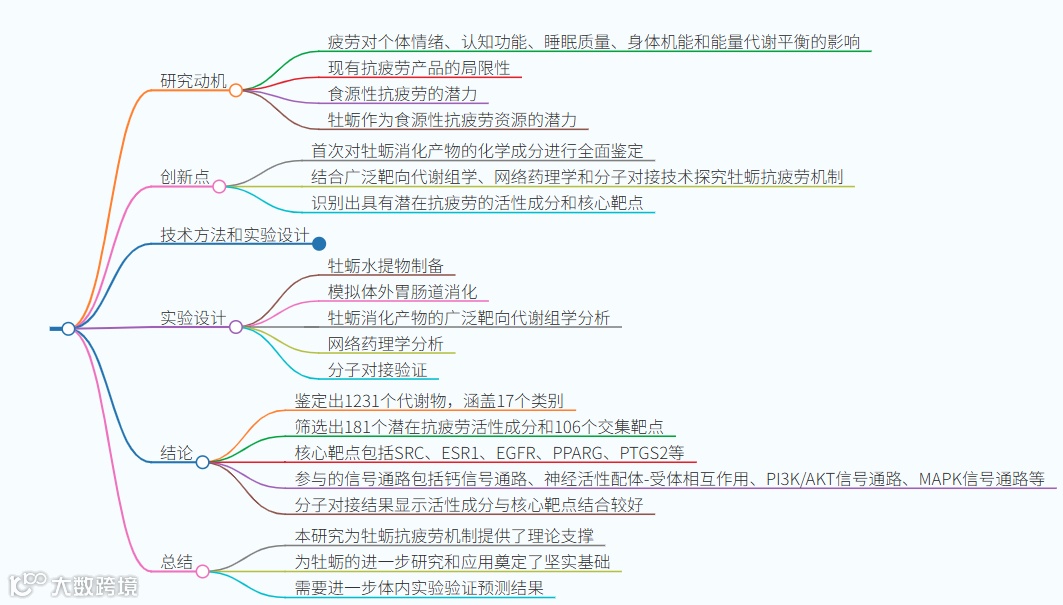 本章节总结了牡蛎抗疲劳作用机制的研究成果:通过广泛靶向代谢组学鉴定出1231种代谢物,涵盖氨基酸、脂肪酰等17类物质;网络药理学筛选出181个潜在抗疲劳活性成分和106个交集靶点,涉及钙信号通路、PI3K/AKT等多条通路;分子对接验证了活性成分与核心靶点的良好结合能力,但需进一步体内实验验证。