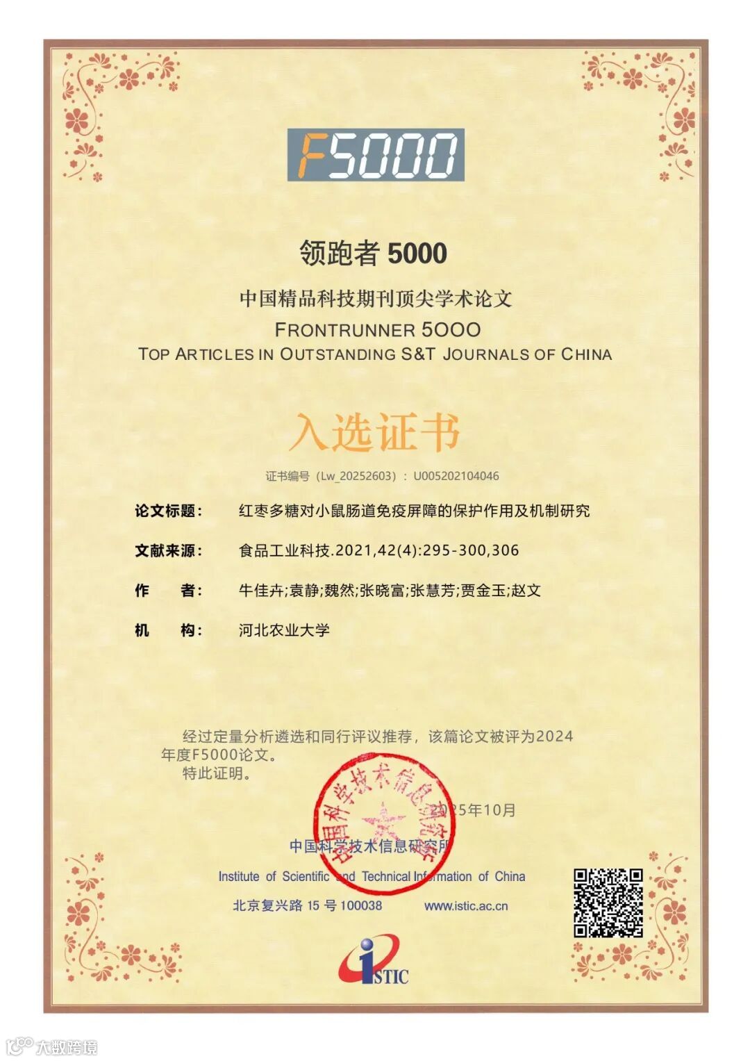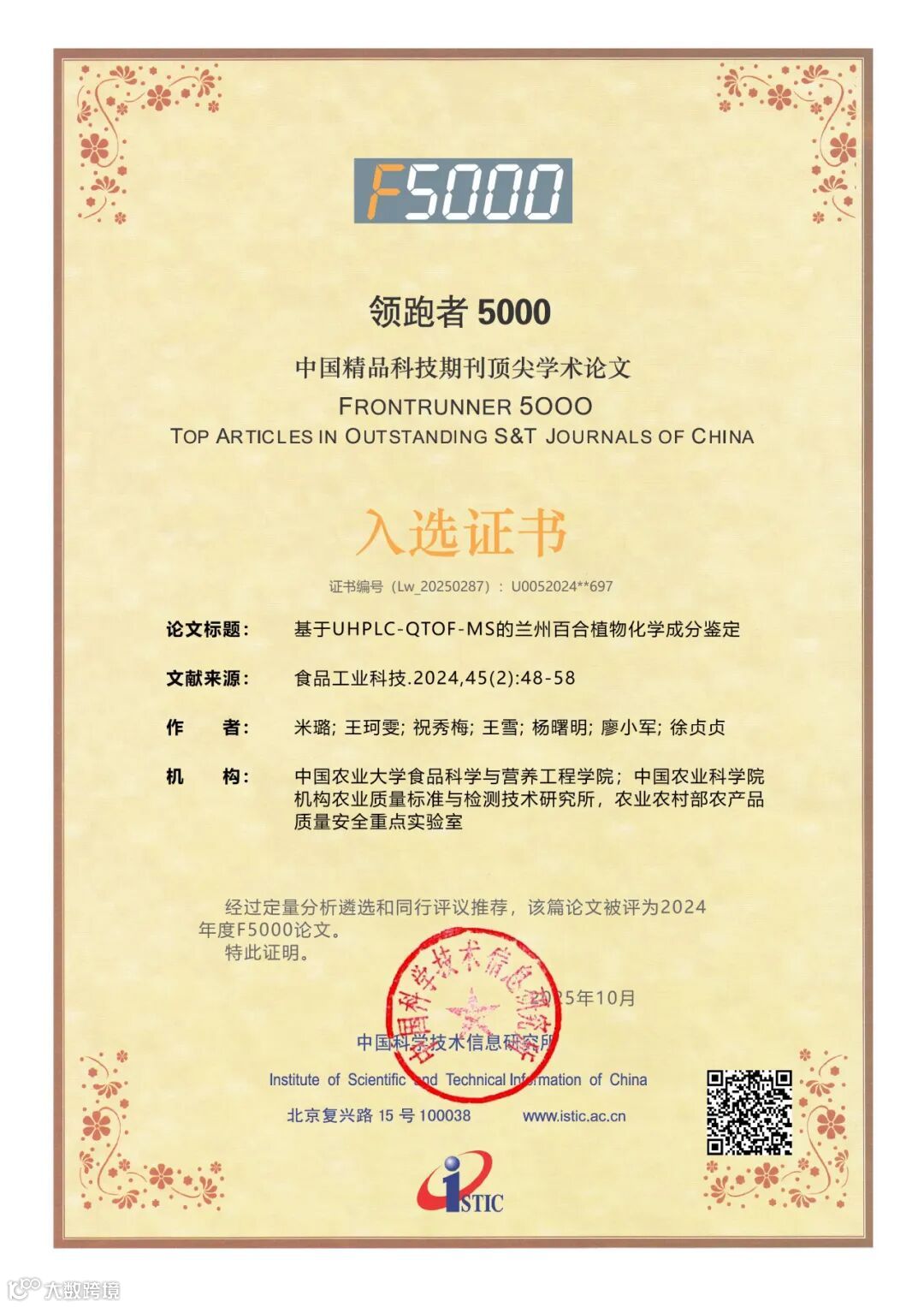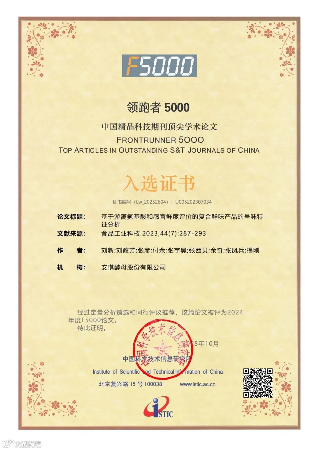 近日,中国科学技术信息研究所(以下简称“中信所”)发布了2025年度“领跑者5000(F5000)——中国精品科技期刊顶尖学术论文”入选名单。其中,《食品工业科技》共有22篇优秀论文入选,衷心祝贺获奖作者!