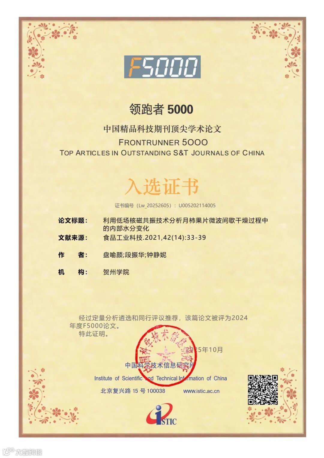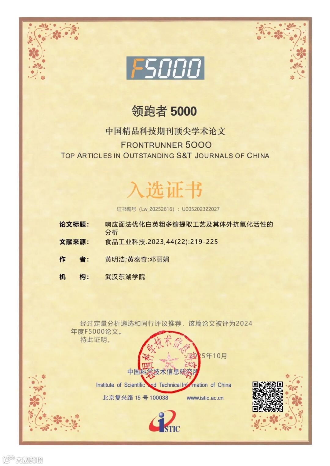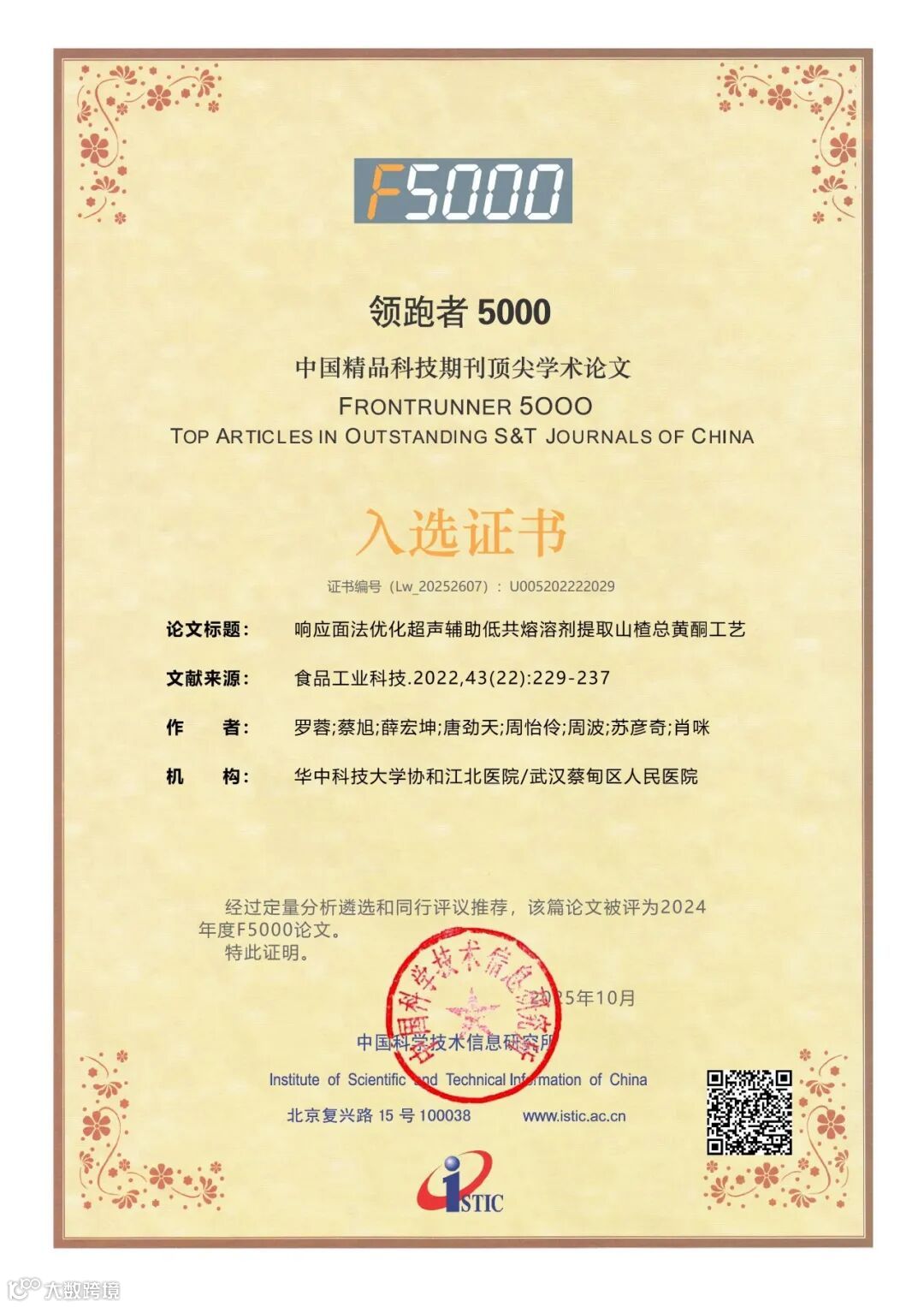 近日,中国科学技术信息研究所(以下简称“中信所”)发布了2025年度“领跑者5000(F5000)——中国精品科技期刊顶尖学术论文”入选名单。其中,《食品工业科技》共有22篇优秀论文入选,衷心祝贺获奖作者!