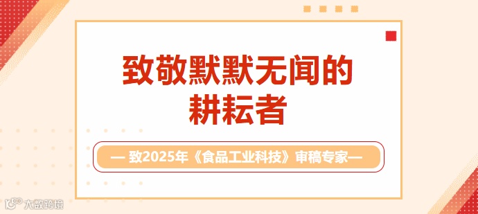 回望2025年,每一份稿件的严谨审校,每一条意见的精准点拨,都倾注着您的心血与热忱。您如春晖沐苗,以专业的洞见为期刊发展保驾护航;您似甘霖润土,以无私的付出为学术质量筑牢根基。正是您不计名利的鼎力支持、精益求精的治学态度,助推《食品工业科技》斩获累累硕果,实现办刊品质的稳步攀升。