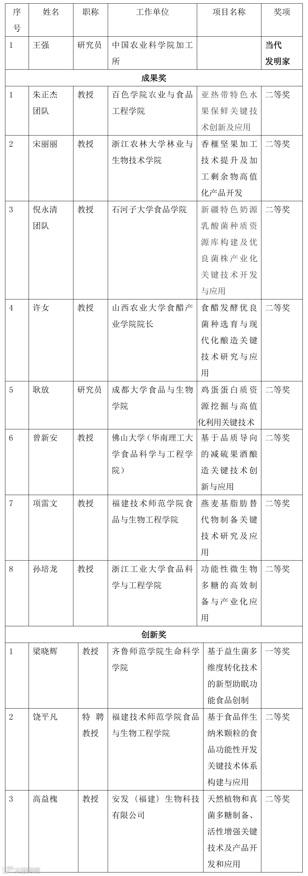 12月26日在2025全国食品工业科技进步大会上颁奖的中国食品工业协会科学技术奖奖励项目中,涉食品学界的科技进步奖和科技创新奖个人的名单如下: