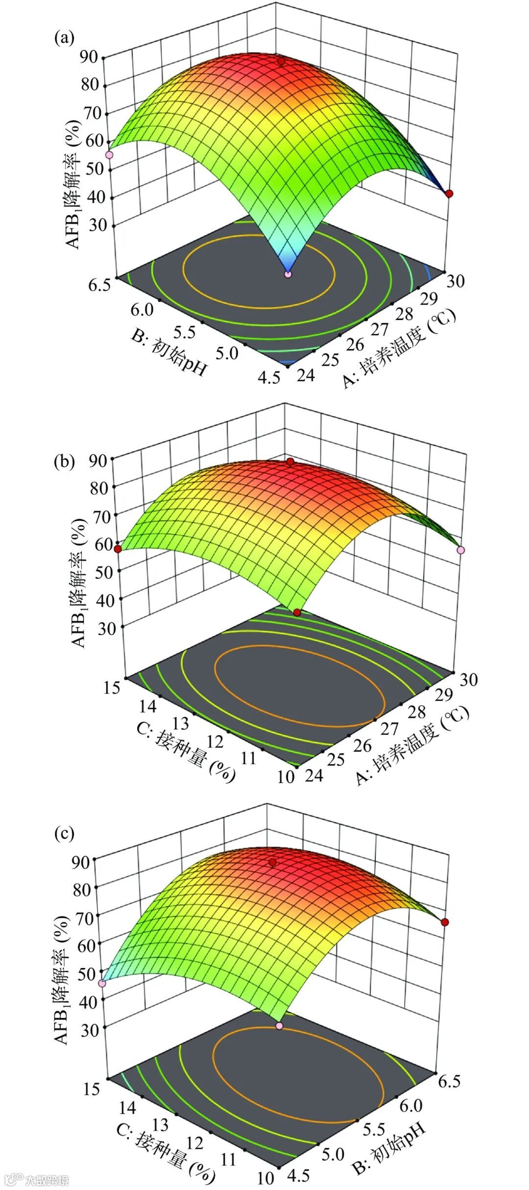 Figure 4. Response surface plots of the effect of factor interactions on the degradation rate of AFB1