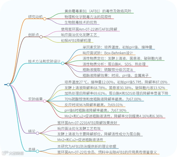 本章节总结了蜜环菌Am-07-22发酵降解黄曲霉毒素B的研究成果,通过响应面法优化发酵工艺,在温度27℃、初始pH值5.7、接种量12.00%的条件下,降解率提升至87.09%;同时初步揭示降解机理,确定发酵上清液为主要降解部位,降解活性成分为热稳定性蛋白酶,Mn和Cu对粗酶液活性有促进作用,为后续研究与应用提供了基础。