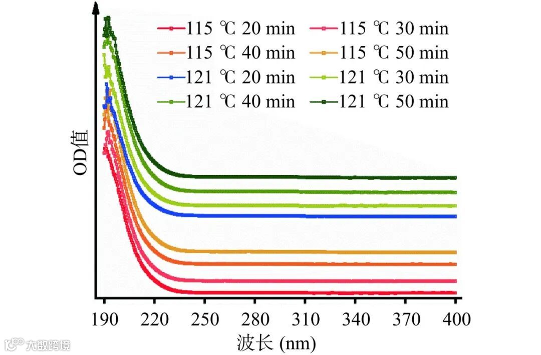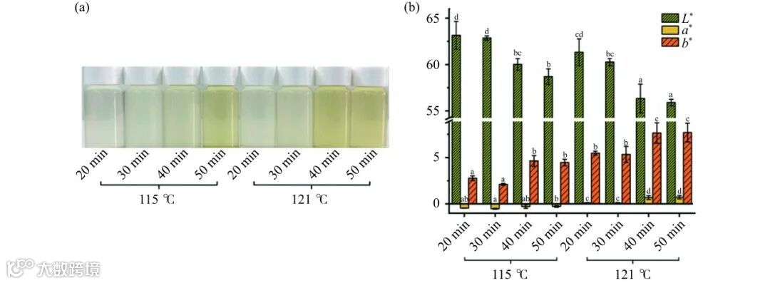 注:a:115 ℃ 20 min;b:115 ℃ 30 min;c:115 ℃ 40 min;d:115 ℃ 50 min;e:121 ℃ 20 min;f:121 ℃ 30 min;g:121 ℃ 40 min;h:121 ℃ 50 min。