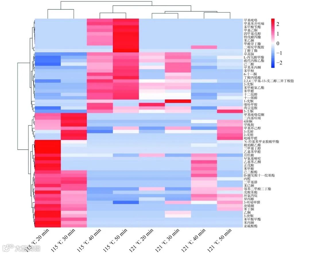 图 9 不同热压条件SCG挥发性化合物的聚类热图